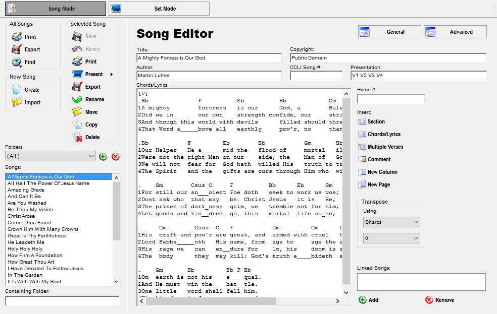 - Keep track of a song's title, author, copyright, ccli #, tempo, time signature, theme, focus, capo position, user defined fields, and more!